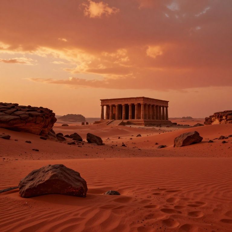 Photograph of a classical Greek-style temple set in a vast, red desert landscape at sunset. The temple, with tall, evenly spaced columns, stands in the center background, illuminated by the warm, orange and pink hues of the sky. Foreground features red sand with visible ripples and scattered large rocks. To the left, a rocky formation adds texture, while the right side shows more sand and rocks. The sky is partly cloudy, enhancing the dramatic lighting. The overall scene evokes a sense of ancient history and desert solitude.
