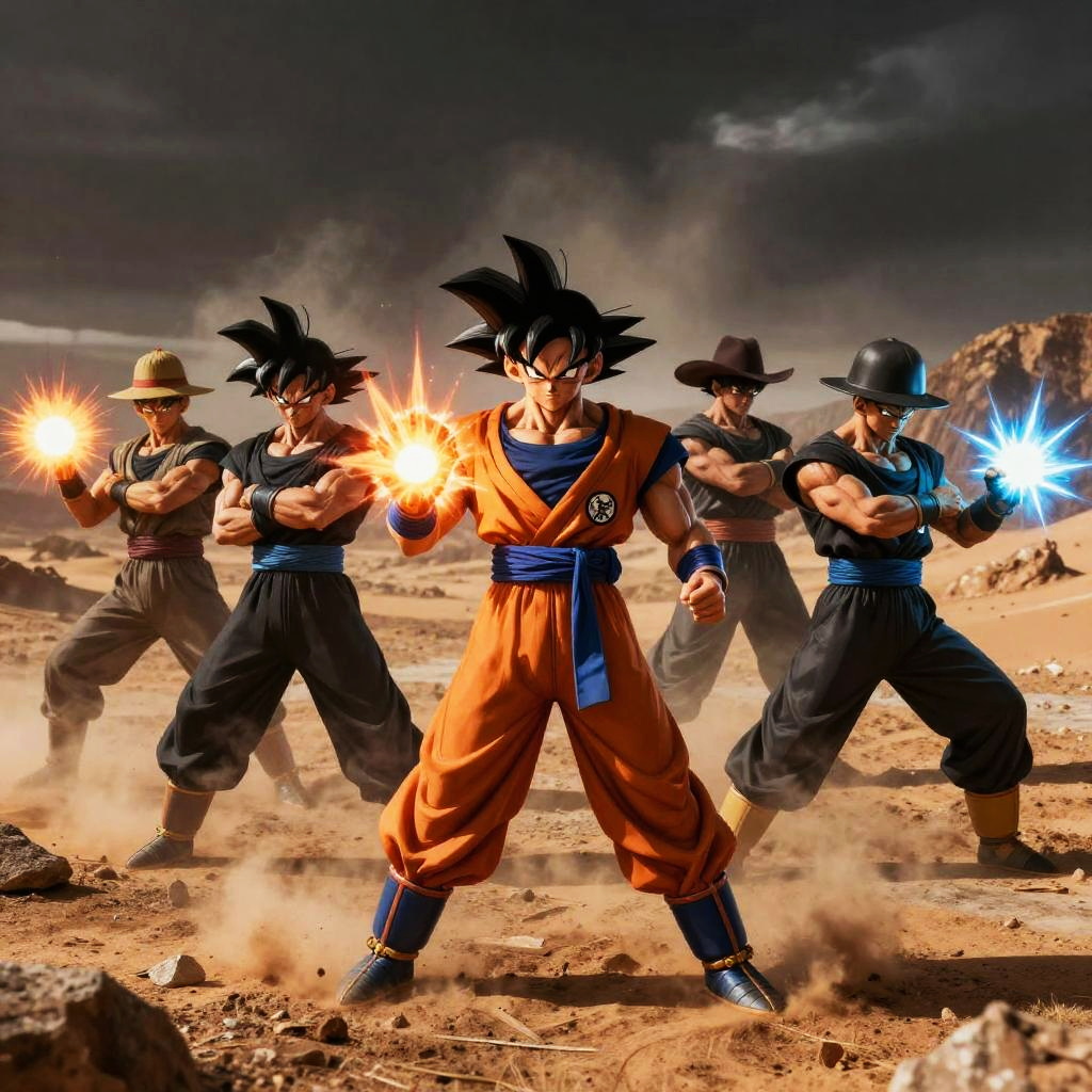 The cartel and Dragon Ball unite in a dark desert landscape, gritty realistic style with cartel members wielding Dragon Ball-inspired energy attacks, smoky atmosphere, dramatic lighting.