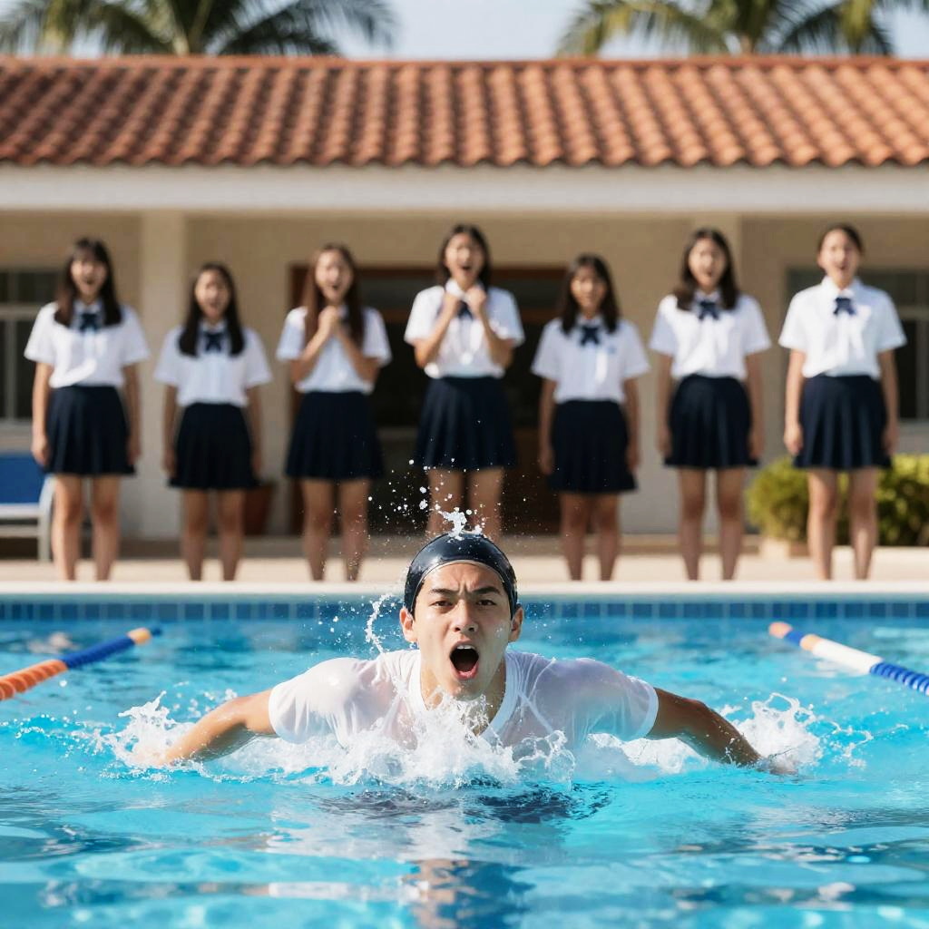 Male swimmer wearing a white shirt and swim cap splashes through a clear blue swimming pool with intense focus. In the background, six female classmates dressed in white blouses and black skirts cheer enthusiastically. The scene is set outdoors near a building with a tiled roof and palm trees, under bright sunlight.