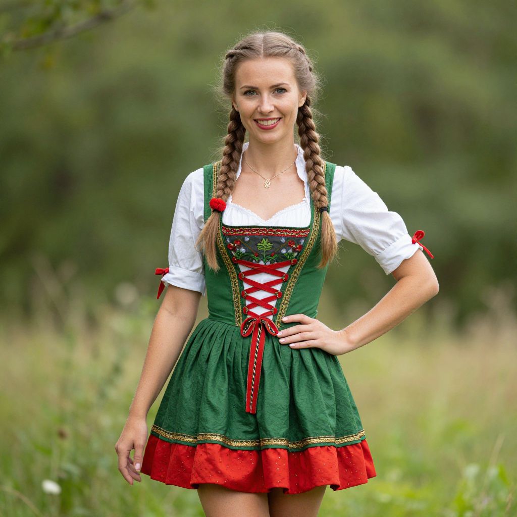 Bavarian Outfit Female Costume, woman with braids in a green and red dress posing for a picture