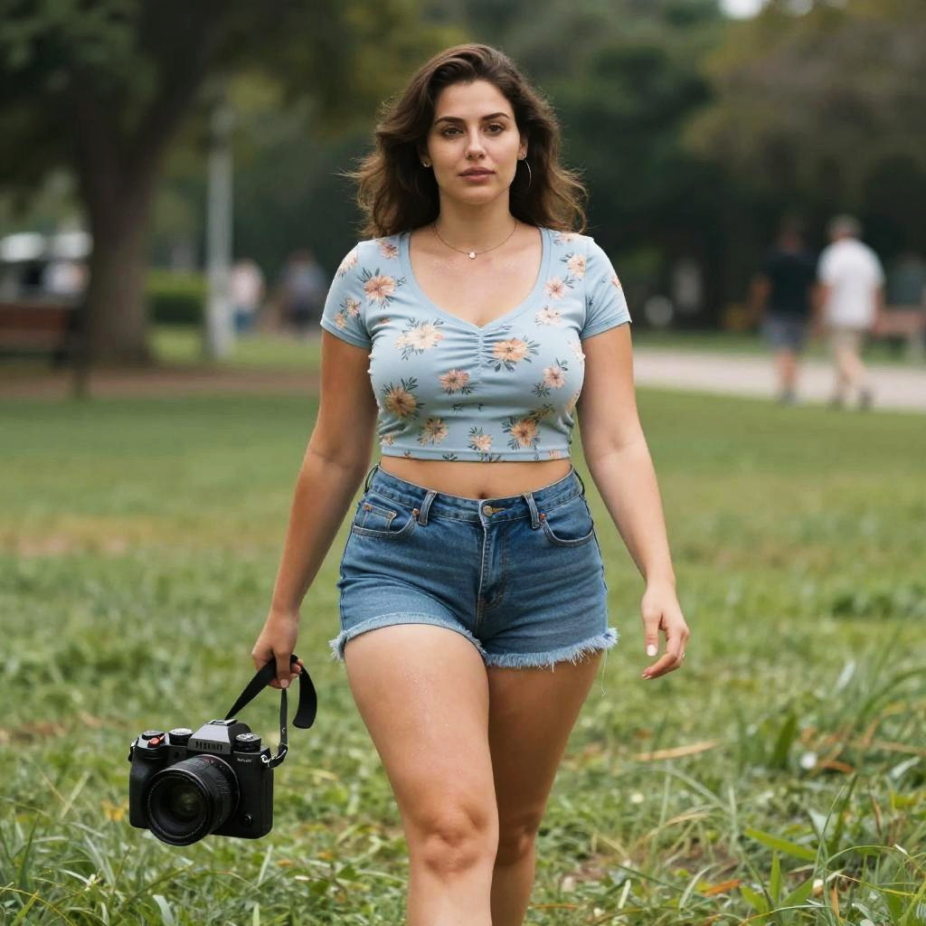 Photograph of a curvy woman with light skin and brown hair, wearing a floral crop top and denim shorts, walking in a park while holding a