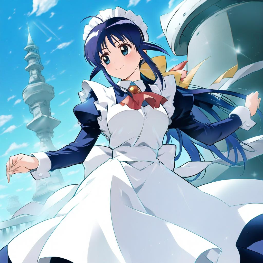 Digital anime-style illustration of a young female maid character with long blue hair and large blue-green eyes. She wears a traditional maid outfit featuring a white apron, maid headdress, and a navy blue dress with a red bow tie. The background shows a futuristic architectural structure under a bright blue sky with scattered clouds.