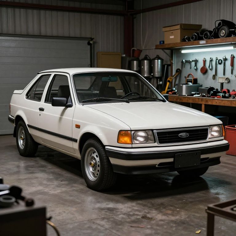 1990 Ford Fusion showcased in a garage workshop setting, surrounded by vintage tools and car parts, dramatic lighting highlighting its boxy shape, hyper-detailed, realistic