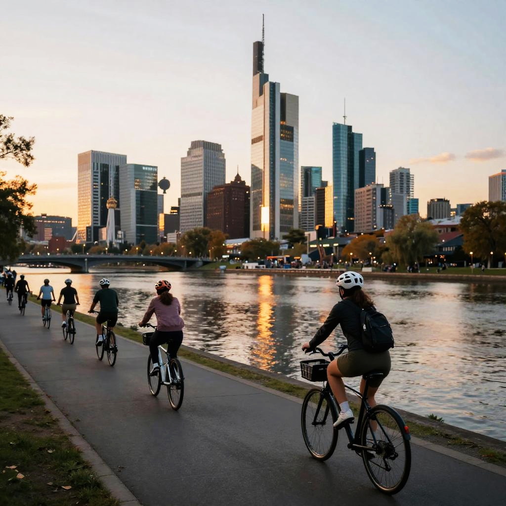 Excursion on a city bike tour at sunset, cyclists riding along a riverside path, modern skyline with skyscrapers glowing in warm light, reflections shimmering on water, dynamic composition with atmospheric perspective and vibrant color palette.