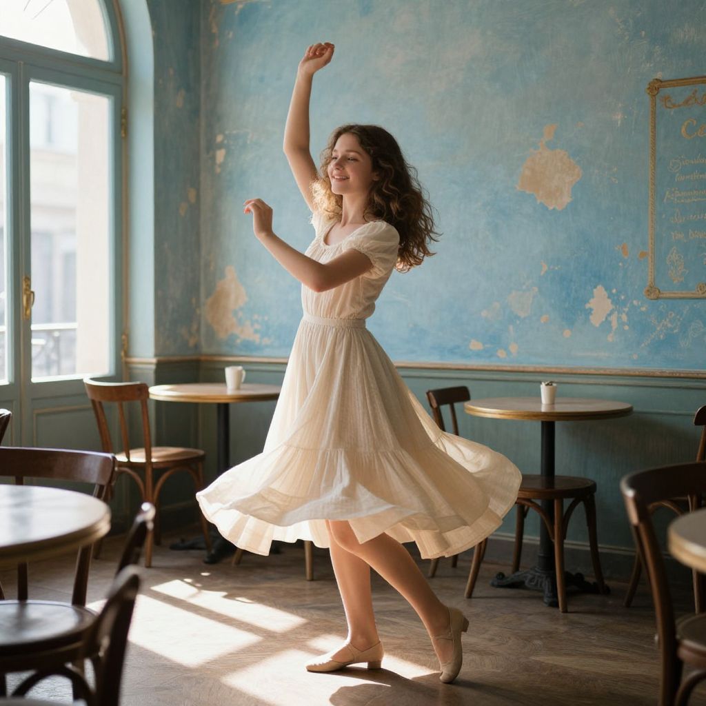 In the heart of an old French café, bathed in the soft, pastel hues of a vintage lens, a young woman dances with grace and joy. The walls, once vibrant, now bear the shabby charm of time, painted in a faded blue that adds a nostalgic touch to the scene. The girl, poised in a cream light dress that flutters gently with each step, is the focal point of the image. Her smile radiates warmth and contentment, as she dances without a partner, lost in her own world. A sunbeam, a beacon of warmth, filters through the café's windows, casting a golden glow on her and illuminating her from the side, highlighting her delicate features and the texture of her dress. The café, with its wooden tables and chairs, serves as a backdrop to this intimate moment, its rustic charm enhancing the overall ambiance of the scene. The composition is balanced, with the girl centrally positioned, drawing the viewer's eye to her and the dance of light and shadow that surrounds her.