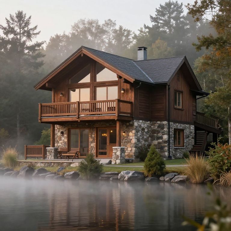 Photograph of a rustic, two-story wooden house with a stone foundation, situated by a mist-covered lake. The house features a large, gabled roof with dark gray shingles, wooden balconies on both levels, and large, illuminated windows. Stone walls and wooden railings add texture. Surrounding the house are tall trees with autumn foliage, and the foreground includes rocks and grasses at the water's edge. The house is warm-toned with natural wood and stone, contrasting against the cool, misty lake and forest background. The sky is overcast, adding a serene, early morning ambiance.