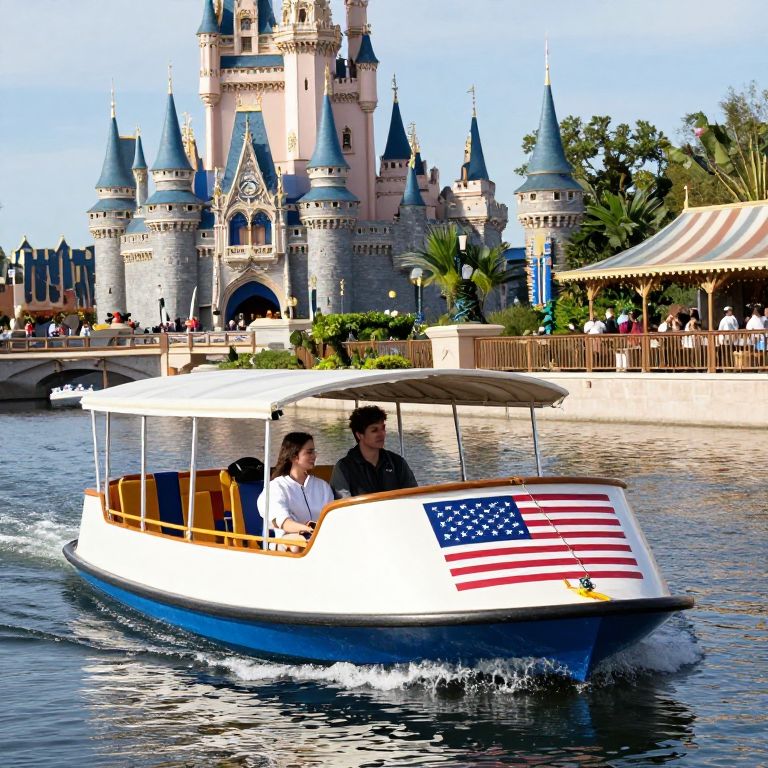 Photograph of a small white boat with a blue trim and an American flag design on the front, cruising on a calm waterway. Two people, a man in a black shirt and another in a white shirt, sit inside. In the background is a fairytale-style castle with multiple turrets and blue roofs, surrounded by lush greenery and a shaded walkway. The boat creates gentle waves in the water, and the sky is clear and blue. The image has a slightly enhanced, vibrant color style.