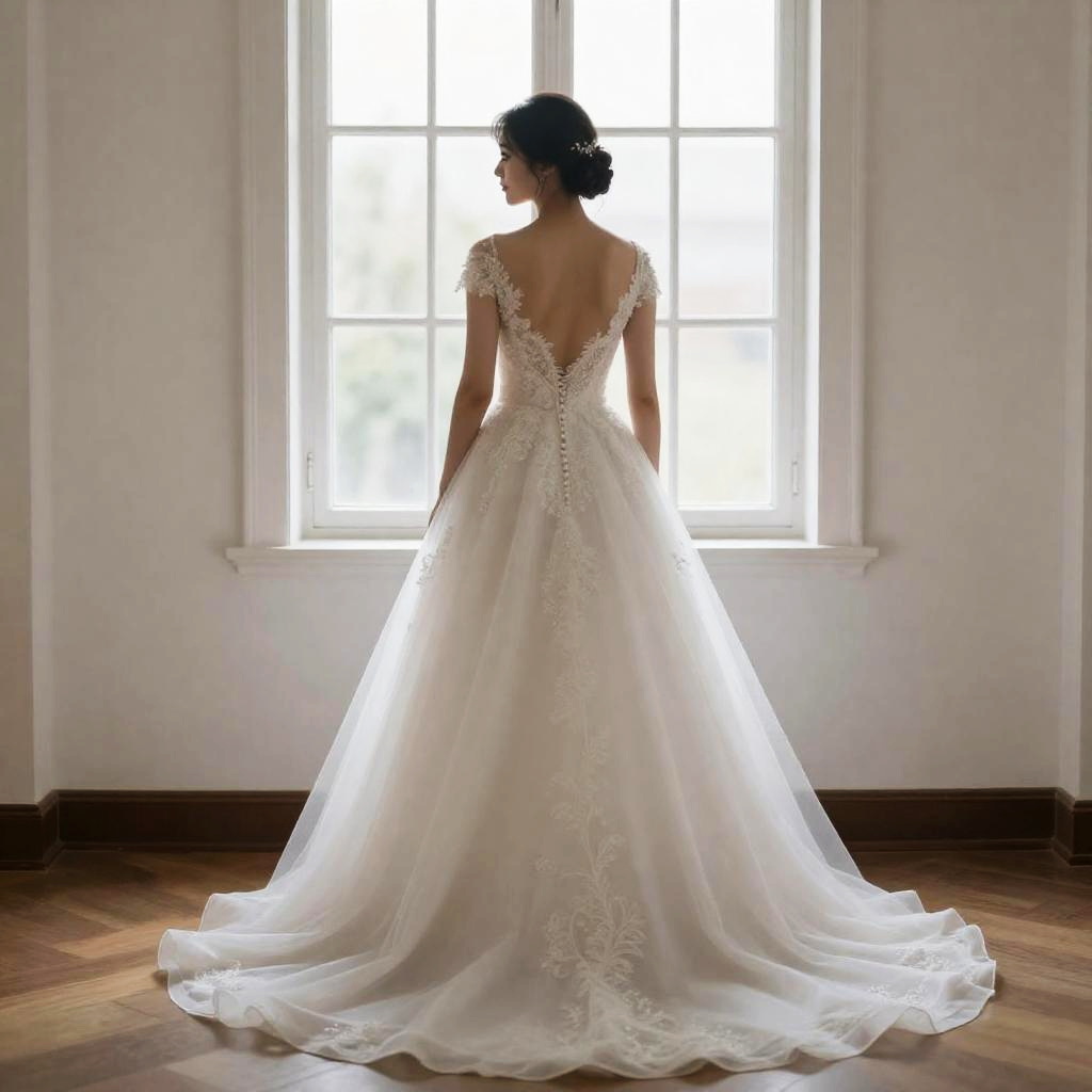 Photograph of a woman standing with her back to the camera in a sunlit room. She wears an elegant, white, lace wedding gown with a deep V-back and short sleeves, featuring intricate floral embroidery. Her dark hair is styled in an elegant updo adorned with a small, sparkling hairpiece. The gown has a long, flowing train that spreads out on the wooden floor. The background includes a large, white-paned window allowing bright natural light to fill the room, casting soft shadows. The walls are plain white, and the floor is a polished, dark hardwood.