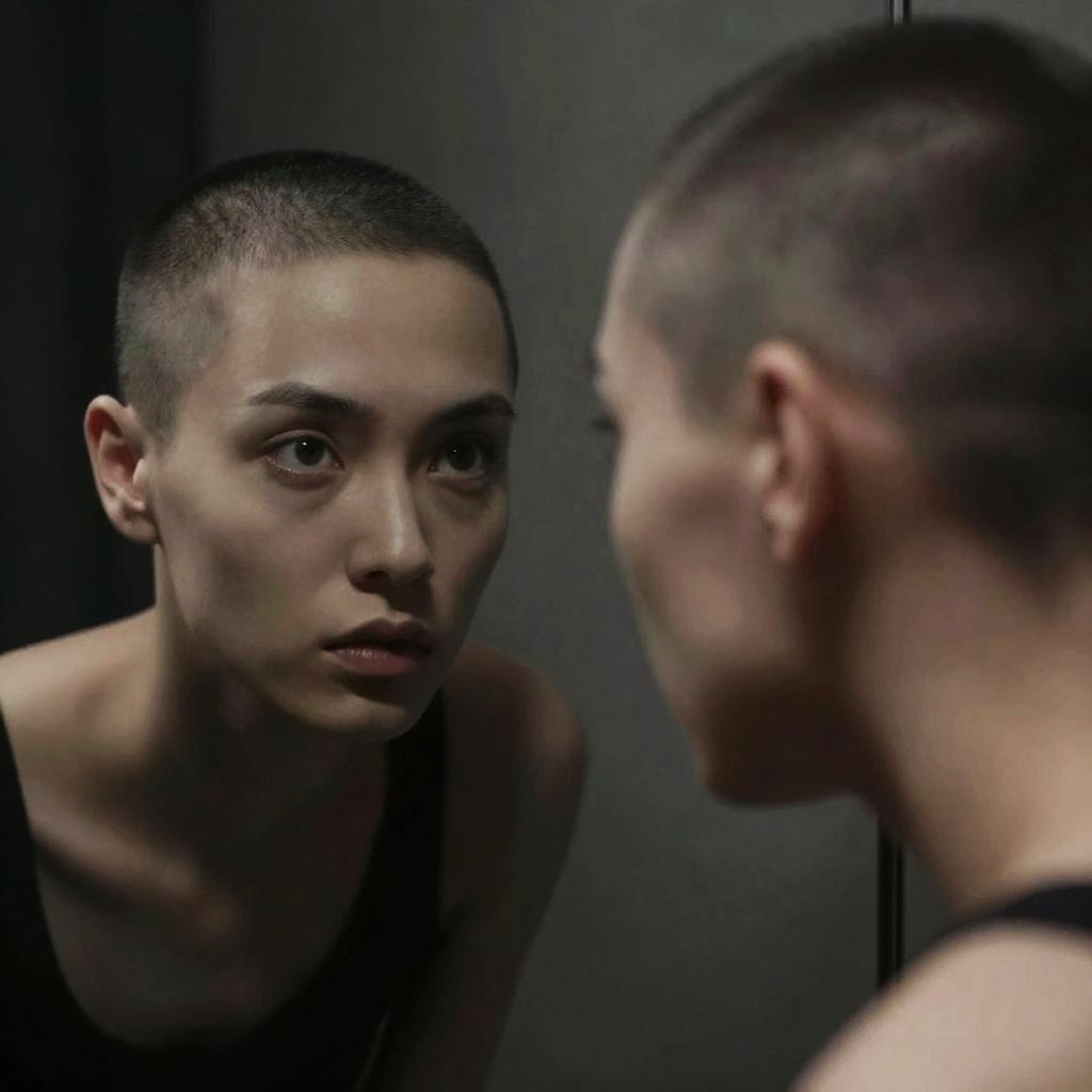 Conceptual image of self-reflection with buzz cut, a person looking into a mirror with buzz cut hairstyle, moody lighting, reflective surface details, emotional depth in eyes, high contrast, digital art, subtle monochrome tones with a hint of color