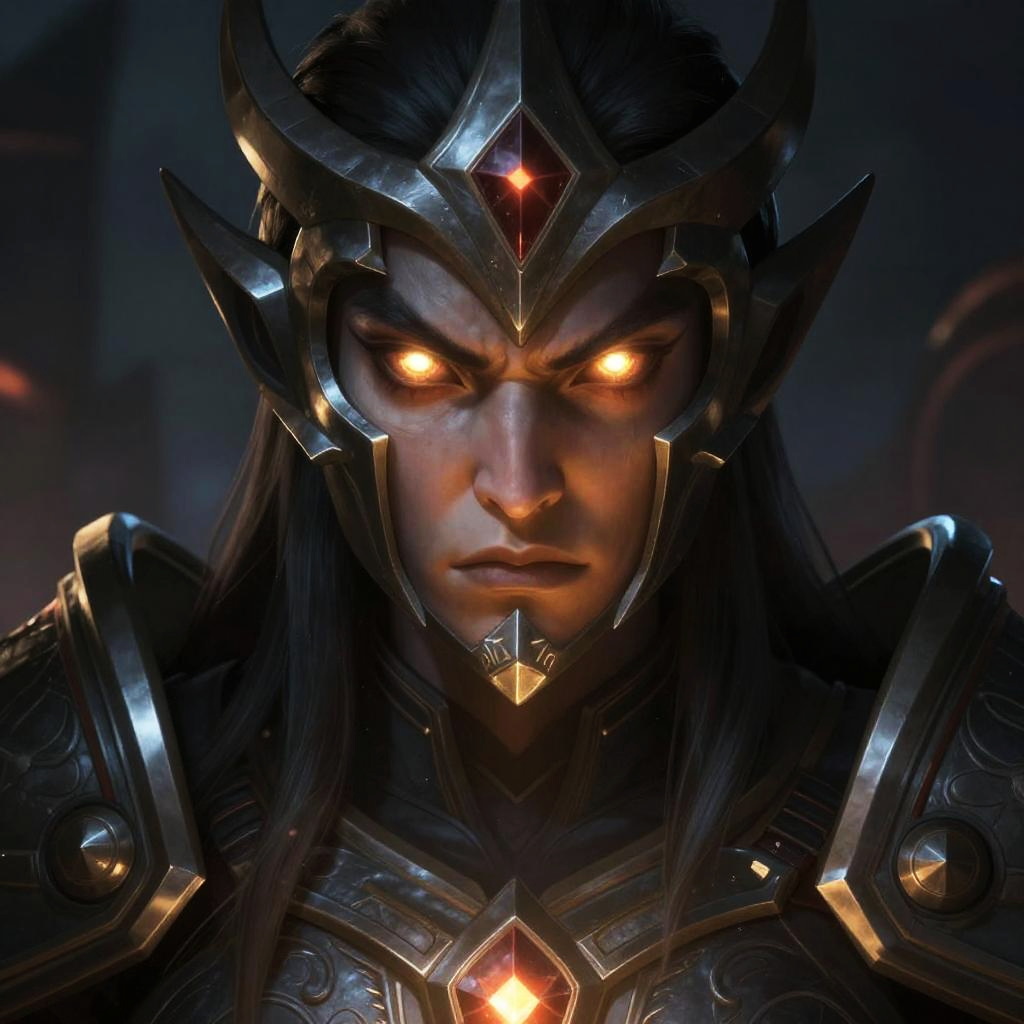 Face of Dota hero, detailed portrait with glowing eyes, intricate armor design, fantasy art style, dramatic lighting, mystical background, epic and powerful atmosphere