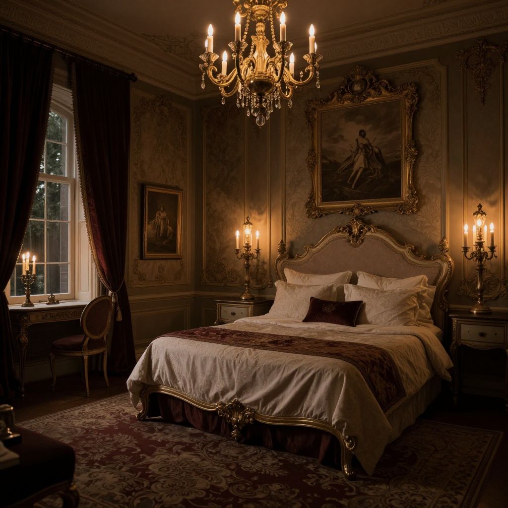 Immersed in opulent luxury, this Victorian bedroom whispers tales of timeless elegance, where the interplay of shadows and candlelight invites introspection, while the rich textures and deep hues evoke a sense of serene sophistication and quiet grandeur.