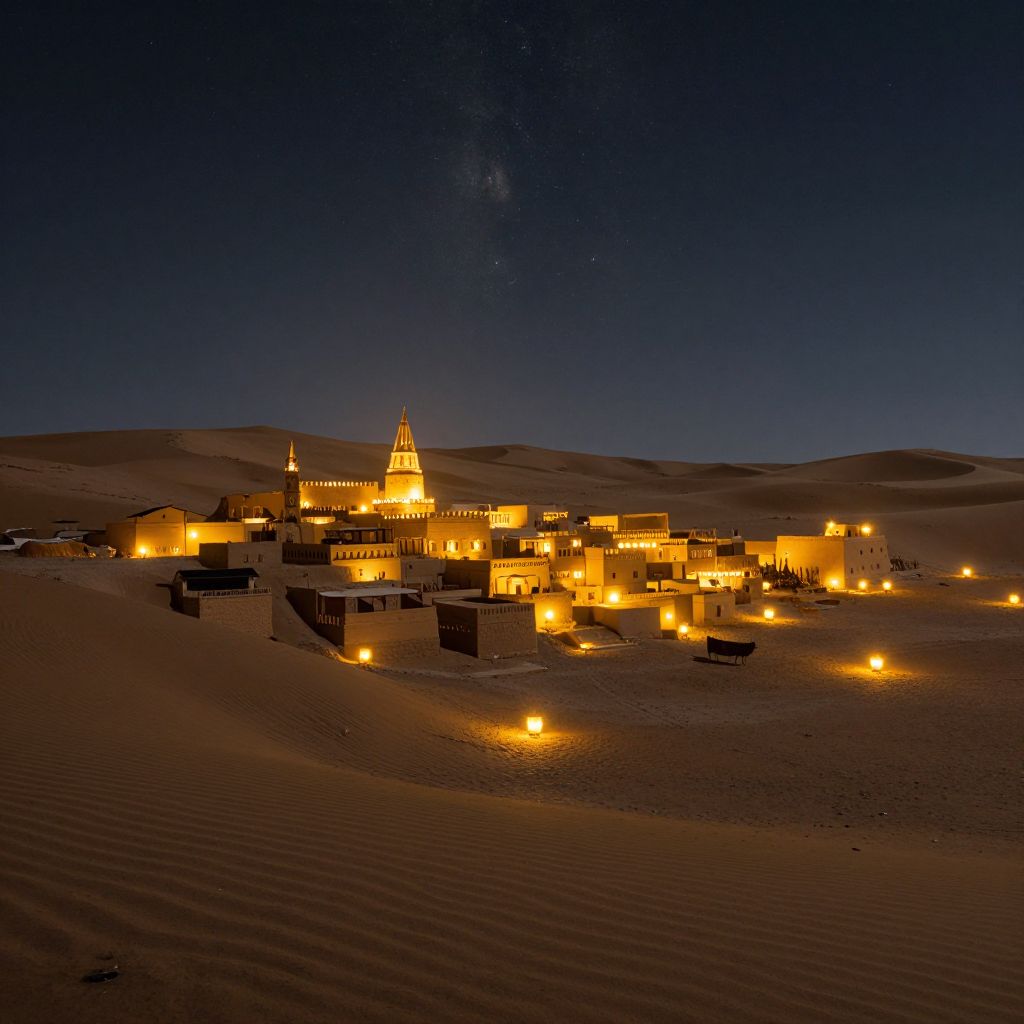Under the starlit desert sky, a silent city of golden hues and flickering lanterns whispers tales of transient beauty, where the warmth of human connection contrasts with the inevitability of vanishing dawn.