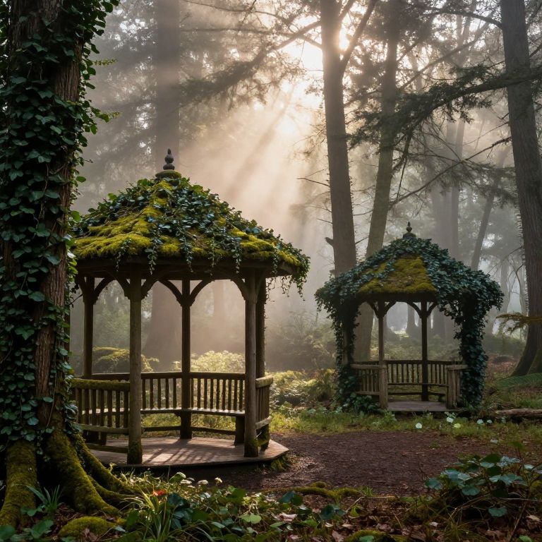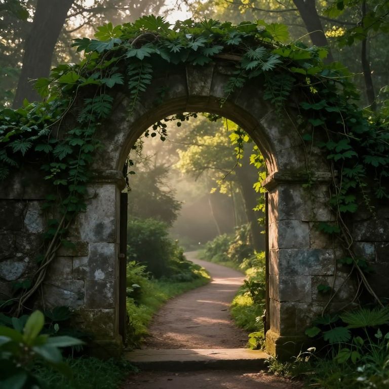 Passage through an ancient stone archway surrounded by lush green vines, soft golden light filtering through, a misty forest path winding beyond, in a mystical fantasy style, highly detailed and atmospheric.