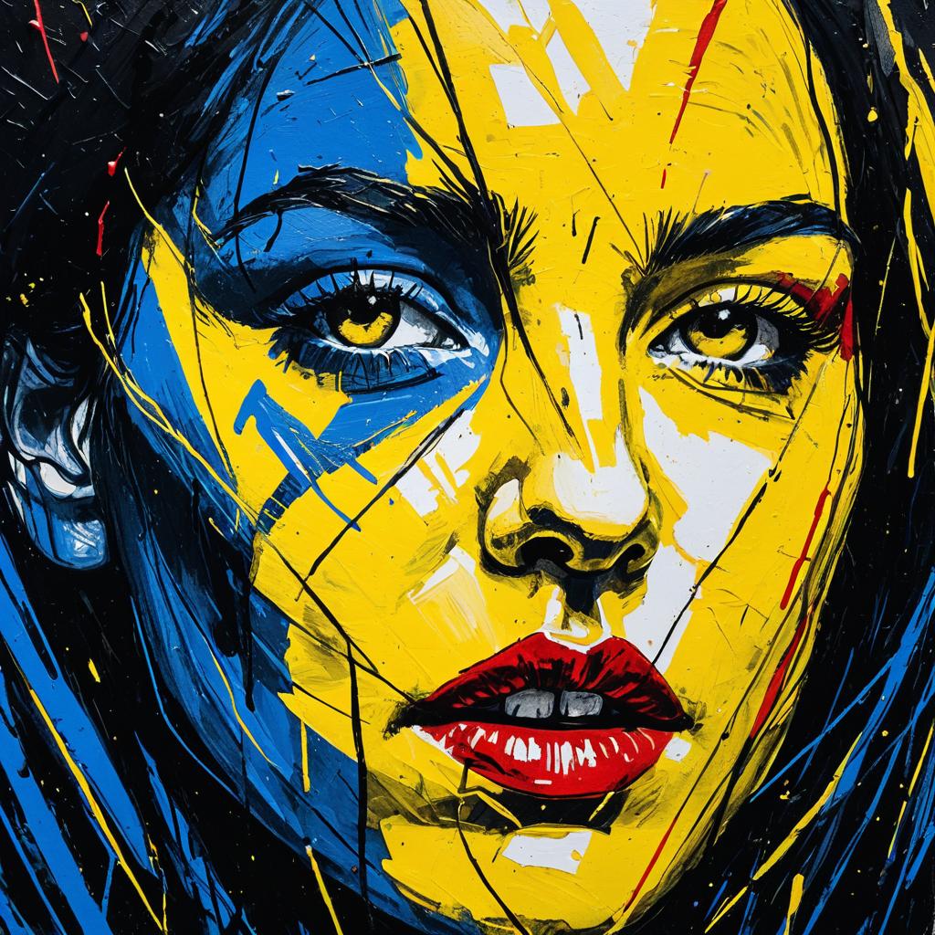An expressive abstract portrait of a person with intense gaze, bold and rough sketch lines, vibrant and dynamic use of acrylic paint textures in primary colors yellow, blue, red, and black, close-up view capturing emotional depth and energy