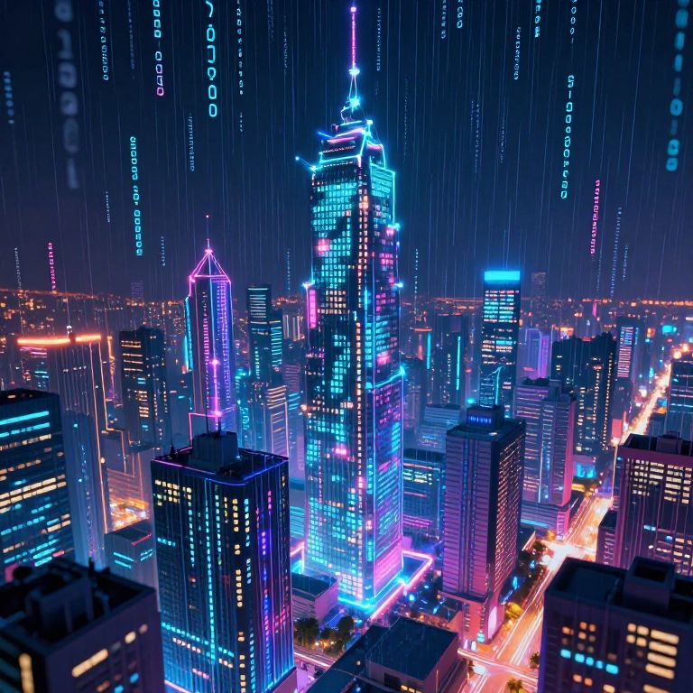 Visualization of datum in a data-driven world, a cityscape built from countless data points and streams, digital rain of numbers falling from the sky, neon-lit buildings shaped like data nodes, cyberpunk atmosphere with vibrant electronic hues