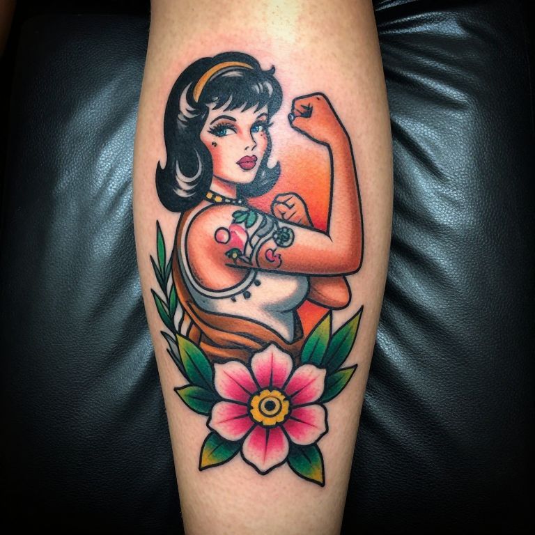 This is a photo of a colorful tattoo on a person's calf. The tattoo features a stylized, pin-up girl with short black hair and blue eyes, flexing her right arm while wearing a white tank top and a brown, sleeveless jacket. She has intricate arm tattoos and is surrounded by green leaves and a large pink flower. The background is black with a slightly shiny texture.