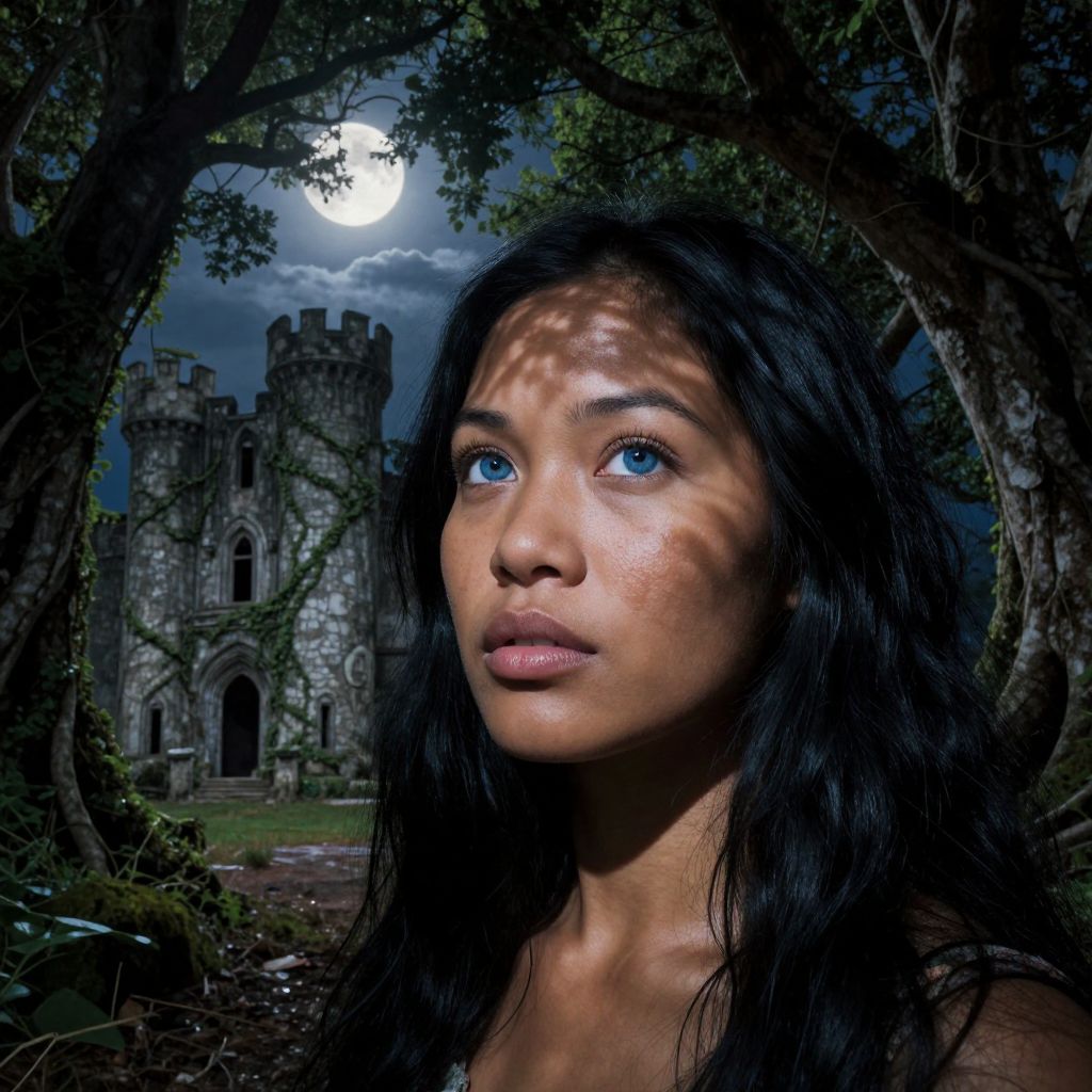 A hauntingly beautiful portrait, reminiscent of Renaissance masterpieces with a contemporary twist, captures a young Melanesian woman with striking blue eyes and raven hair as she emerges from the shadows. Viewed from an unconventional 'worm's-eye view', her delicate features are illuminated by ethereal moonlight filtering through a canopy of ancient trees, casting dappled patterns on her translucent skin. In the background, an abandoned stone castle, engulfed in vines, evokes a sense of desolation and timelessness, contrasting with the woman's serene expression and hinting at a mysterious story yet to unfold.