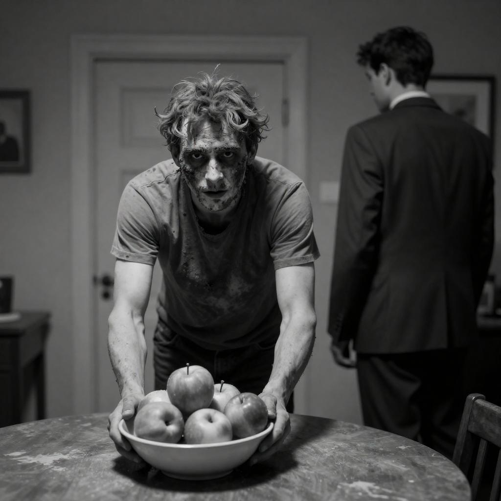 Black and white photograph. Man with grotesque, mud-covered face and hands leans forward, holding bowl of apples on round table. Second man in dark suit stands with back to camera. Dimly lit room with doors and framed pictures.