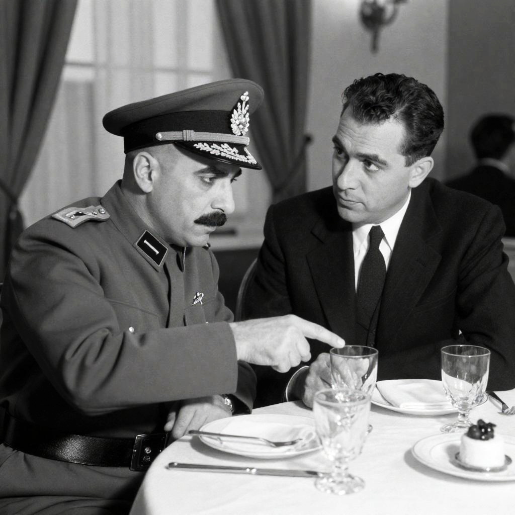 Vintage illustration of two men sitting at a table. Military officer with mustache, gray uniform, and peaked cap points right. Second man, in black suit, white shirt, and red tie, holds a glass. Both have serious expressions. Background includes draped curtains. Round border surrounds them.