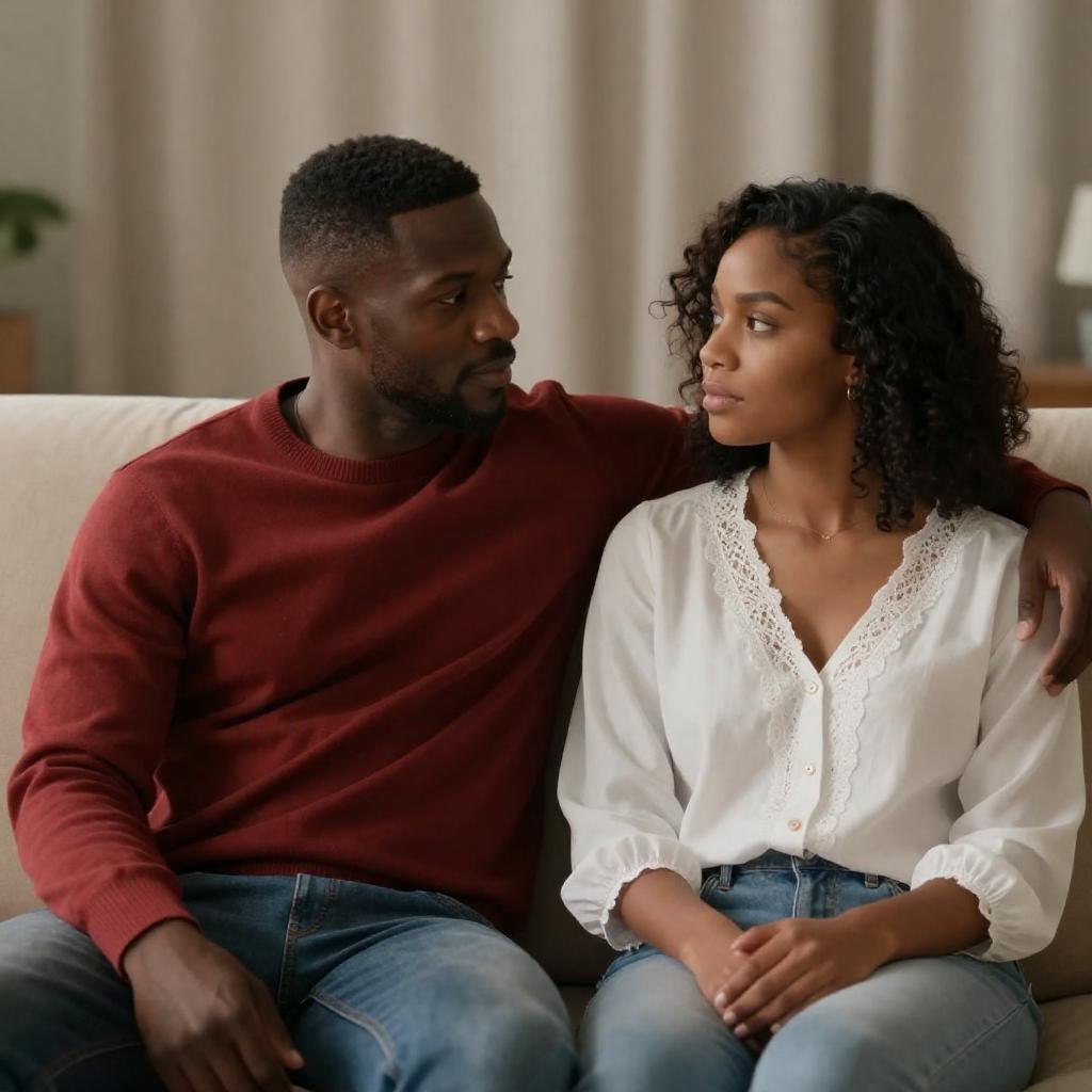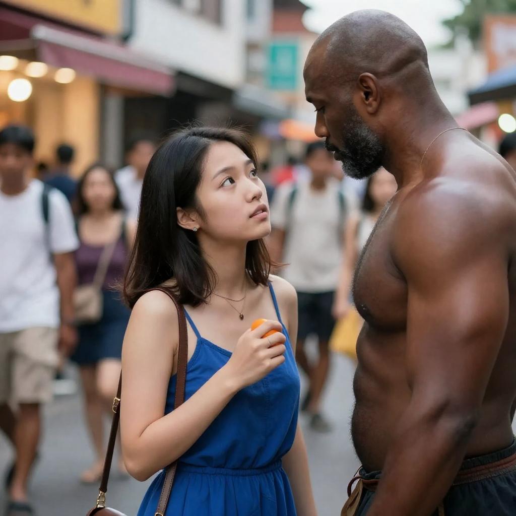 Photograph of a street scene. A young Asian woman with dark hair and a blue dress looks up at a muscular, bald, dark-skinned man with a ured, grayish face. She holds an orange object near her chest. Background: blurred crowd, people walking, bright lights, and colorful storefronts. The man stands close, looking down at her.
