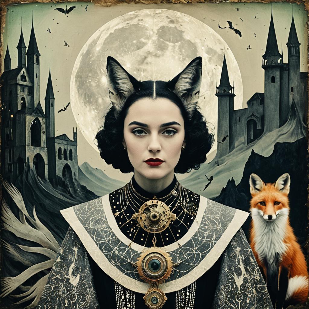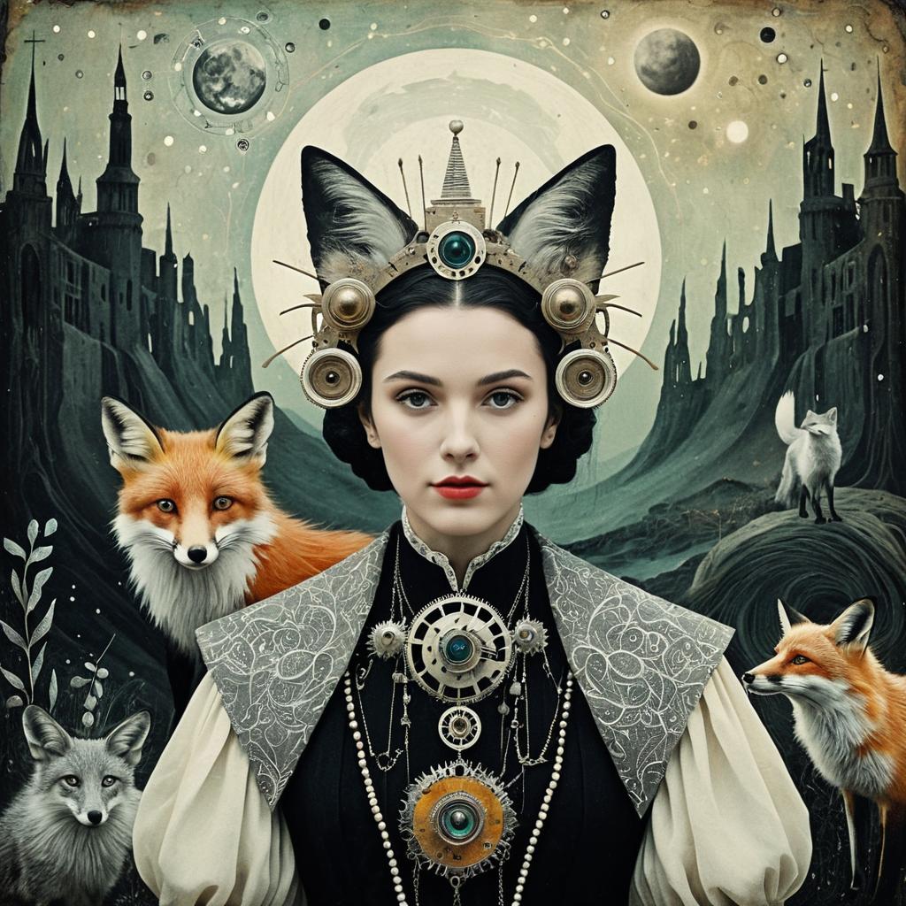 A haunted guardian with a memory that survives the end of time and a small cogwheel raven on her shoulder. Collage artwork inspired by Audrey Kawasaki, combining surreal and dreamlike elements with intricate textures and layered imagery. The artwork blends redemption with a mixed-media aesthetic, capturing an atmosphere of wistful reflection.
