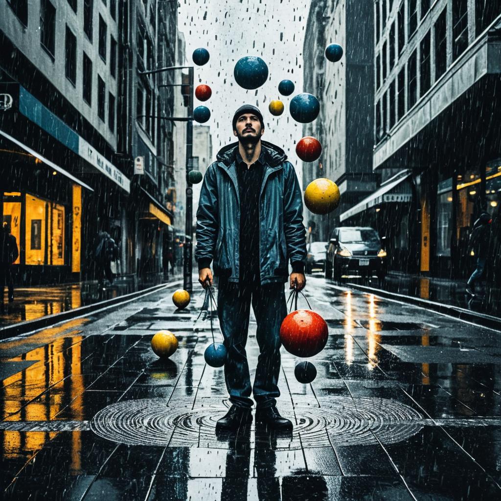 Editorial illustration of juggling circus performer in a vintage outfit, full body portrait, surrealist collage fused with cubist shards, with diffused amber spotlight on swirling smoke, fine texture, dither, dynamic perspective, detailed composition