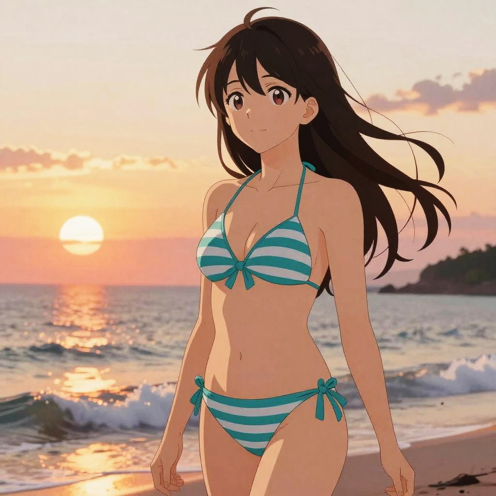 An anime-style illustration of a woman with short hair standing on a beachside boardwalk, featuring vibrant colors and a tropical setting.
