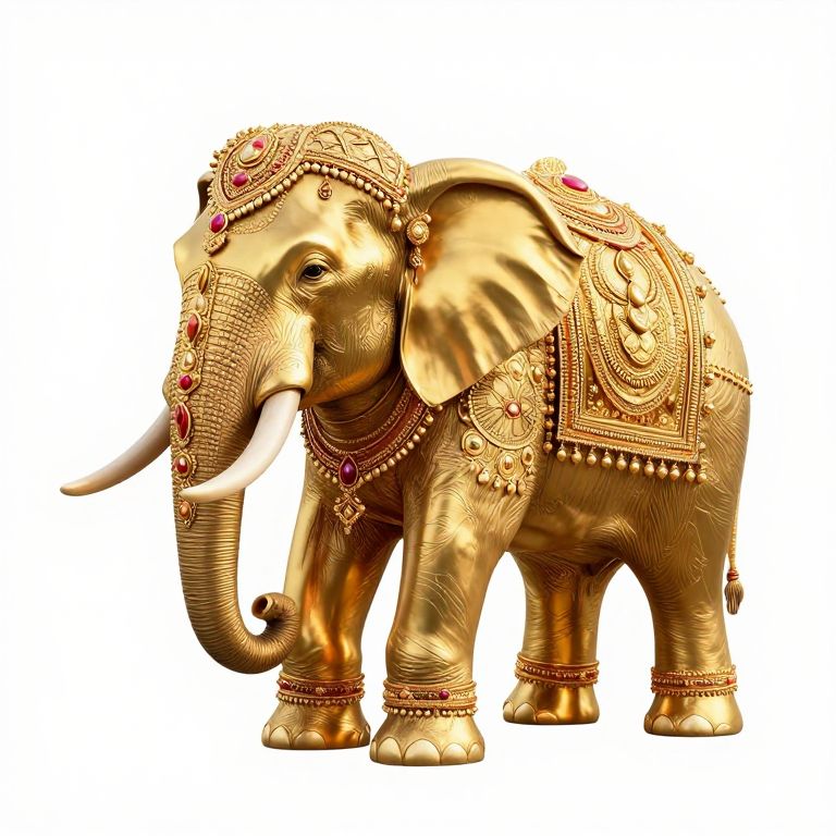 Gold-painted elephant with detailed jewelry, including a headpiece and necklace, standing against a white background. Digital illustration.