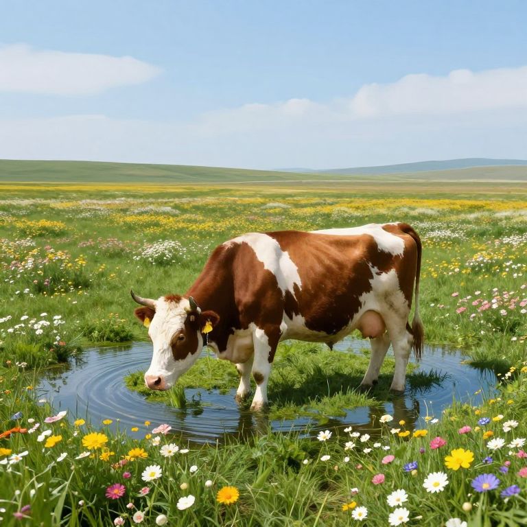 Photograph of a brown and white cow standing in a shallow pond, surrounded by a vibrant, flower-filled meadow under a clear blue sky.