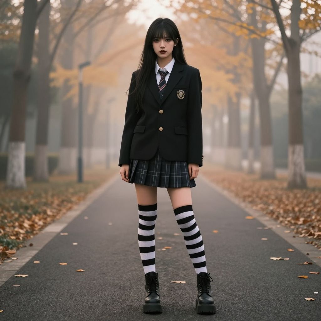 Goth uniform, classic school setting, black blazer with emblem, plaid skirt, striped thigh-high socks, heavy boots, dark makeup, foggy autumn morning, cinematic composition
