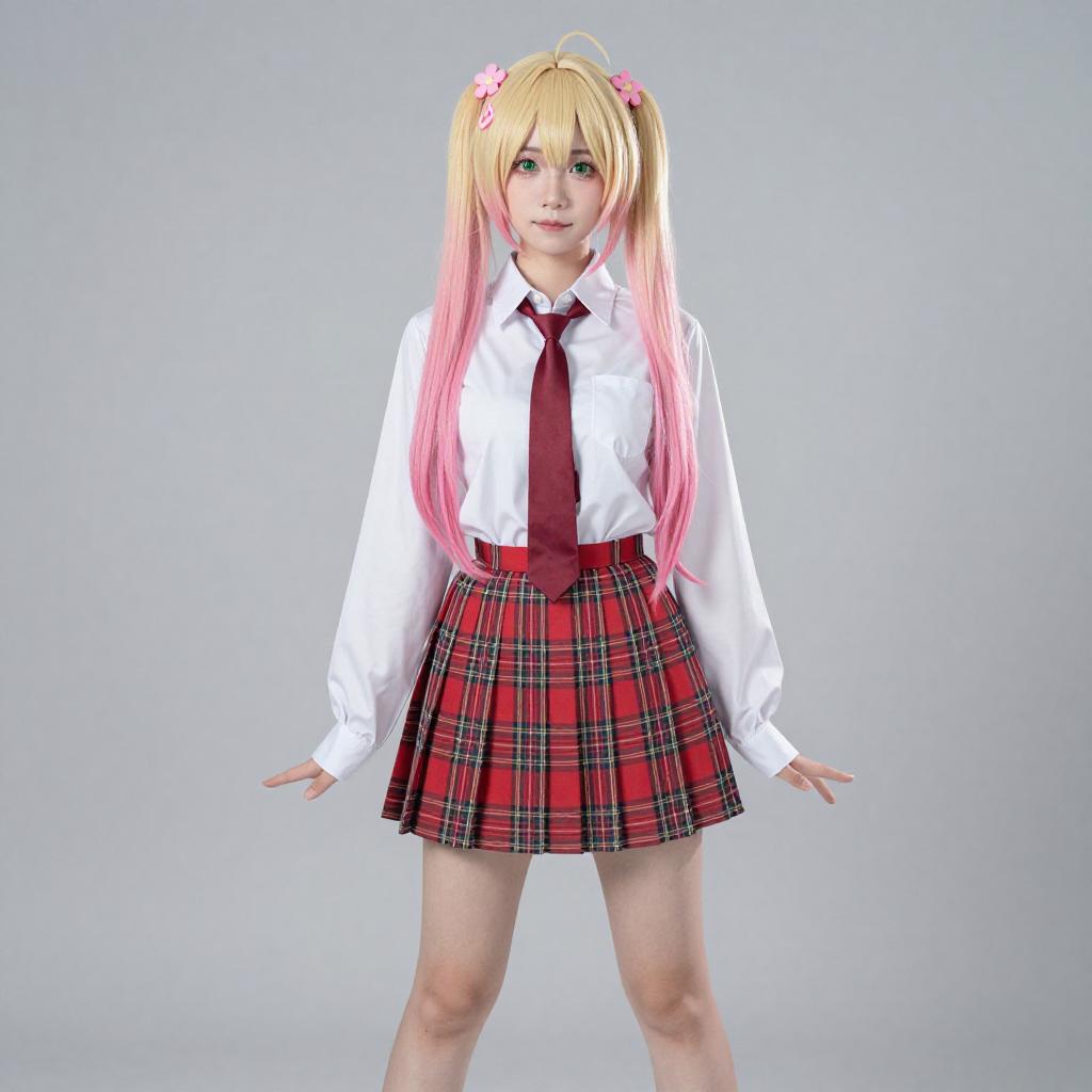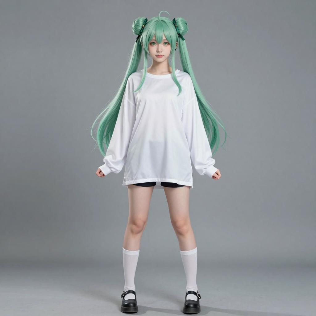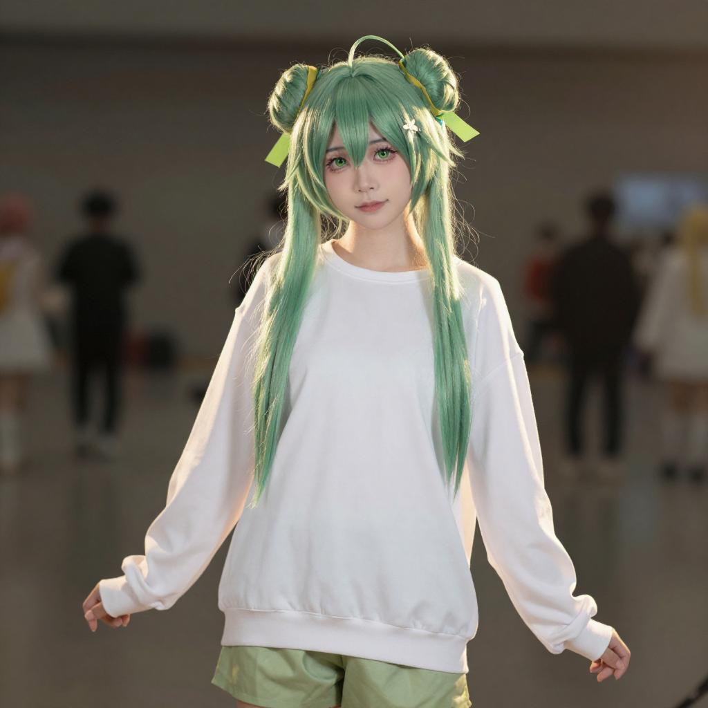 Photo-realistic cosplay photo of person in morinaka kazaki costume. Full body. Standing. Full length. 1girl, green eyes, green hair, long hair, double bun, hair bow, long sleeves, sleeves past wrists, virtual youtuber, virtual youtuber, professional photoshoot