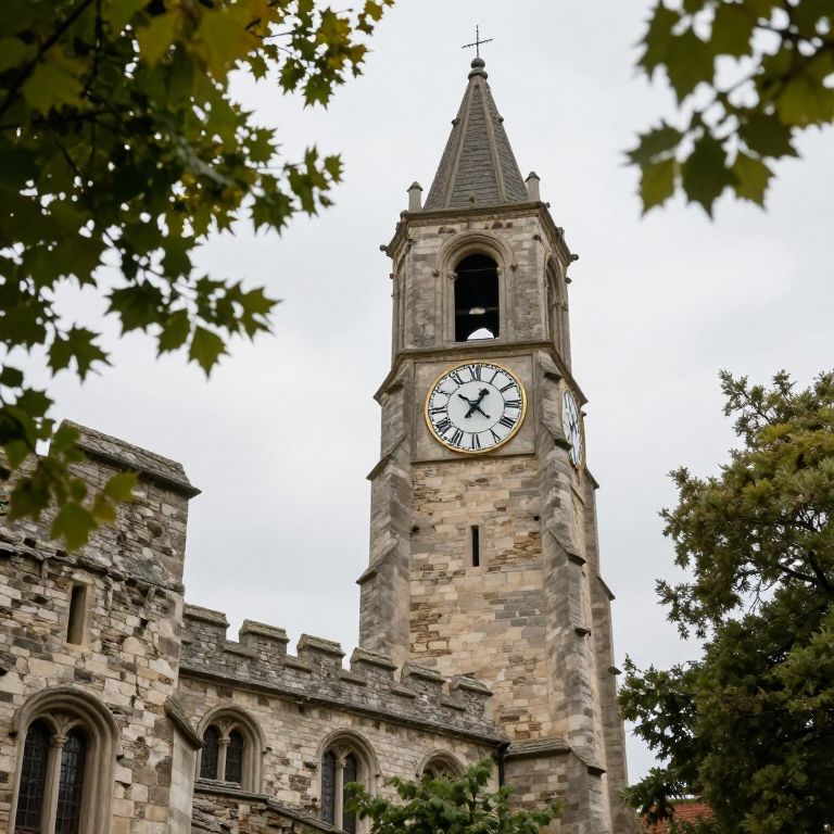 Photograph of a historic stone church with a tall, square bell tower featuring a large, white clock face with black Roman numerals and hands. The tower has a steep, dark grey slate roof and a small cross on top. The church's facade includes arched windows with black iron bars, and the walls are made of aged, tan and gray stone. Leafy green trees frame the image on the left and right sides, with a bright, overcast sky in the background. The overall scene exudes a sense of old-world charm and tranquility.