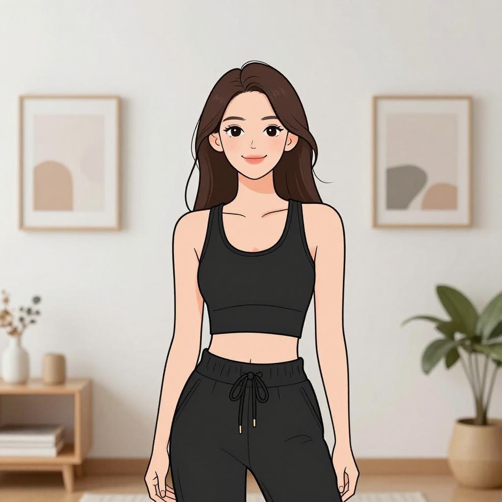 Digital anime-style drawing of a fair-skinned woman with long brown hair, wearing a black sports bra and black pants, standing in a minimalist living room