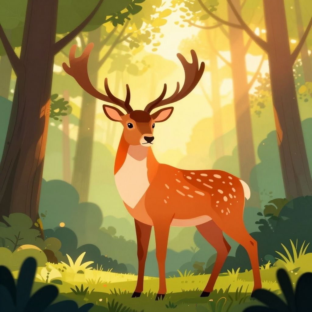 Illustration of a majestic deer with large antlers standing in a vibrant forest at sunrise or sunset. The deer has a colorful, stylized appearance with orange, brown, and white patterns. The background features tall trees with green foliage and bright sunlight streaming through, creating a warm and lively atmosphere.