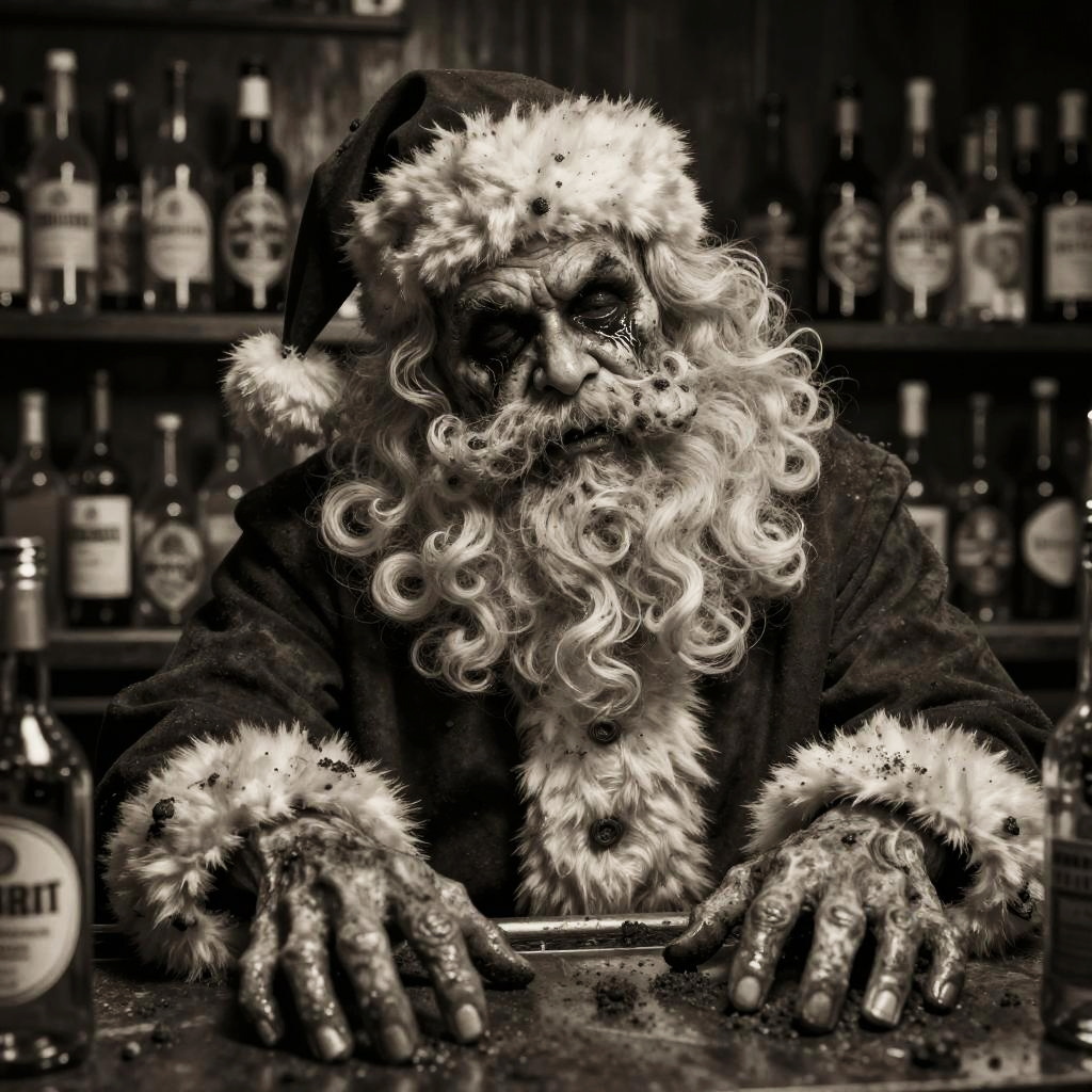 Sepia-tone image of a creepy, muddy Santa Claus sitting at a bar with multiple bottles of alcohol behind him. The figure features a detailed, weathered face with dark, hollow eyes and worn, dirty hands resting on the counter. Wearing a traditional Santa suit with fur trim and hat, the scene conveys a dark, cinematic, and gritty atmosphere with muted colors and film grain effects.
