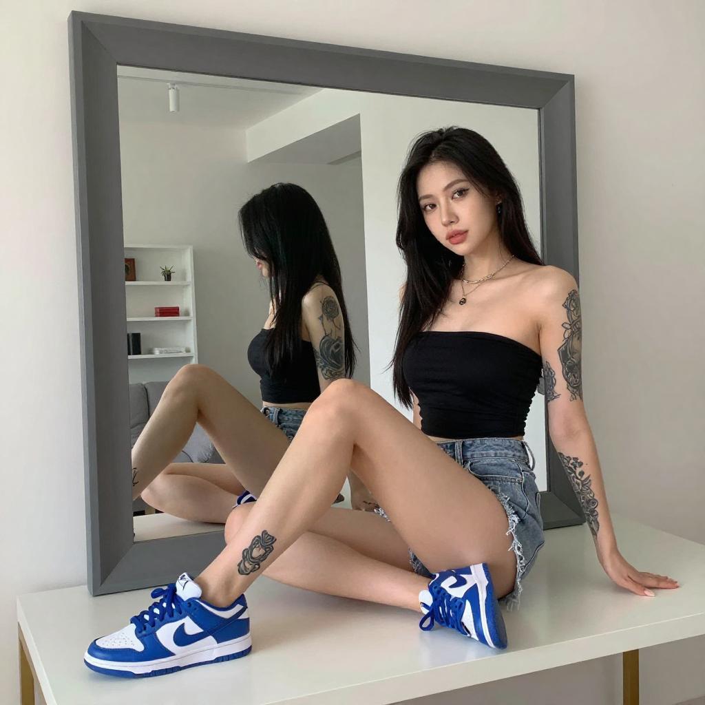 Photograph of a woman with long black hair, fair skin, and tattoos on her arm and thigh, sitting on a white table. She wears a black strapless top, denim shorts, and blue Nike sneakers. A large mirror with a gray frame is behind her, reflecting a modern living room with a gray sofa and white shelves.