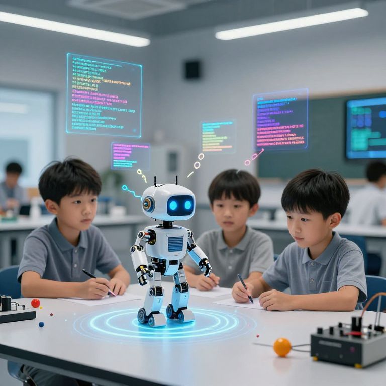 AI prompt kids building a robot with AI-powered tools in a STEM lab, surrounded by floating code streams and colorful feedback loops, in a modern, hands-on learning environment.