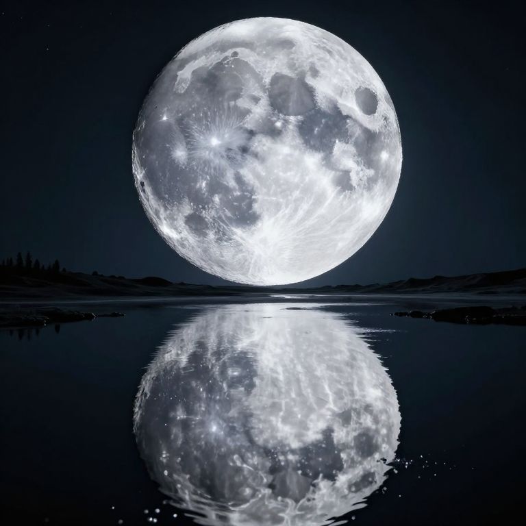 A colossal moon looms over a desolate landscape, its surface shimmering like liquid mercury, reflecting the night sky perfectly in a serene pool below, where a mysterious burst of light hints at hidden secrets beneath its mirrored facade.