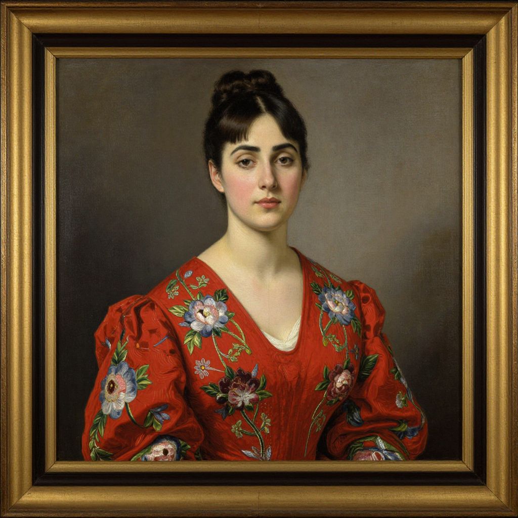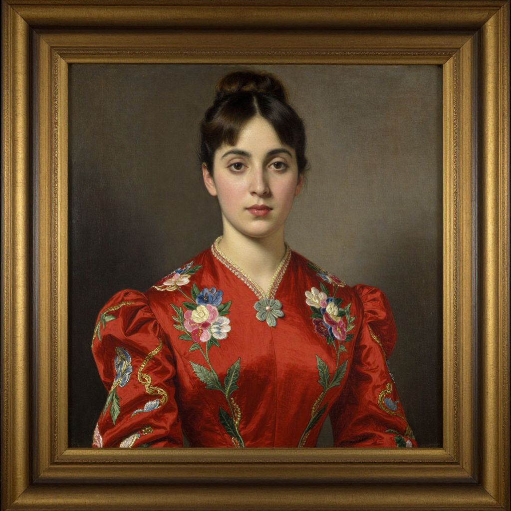 Exquisitely framed portrait of a woman in a richly detailed red dress with floral embroidery, set against a muted background, showcasing the refined style of Pablo Segarra Chias' 1945 Spanish Realistic Figurative painting.