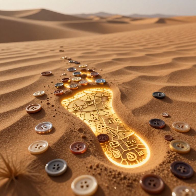 A mesmerizing 3D-rendered desert landscape crafted entirely from shimmering buttons, where each footprint reveals a glowing, golden map etched with ancient symbols, evoking a sense of mystery and discovery through its intricate digital artistry.