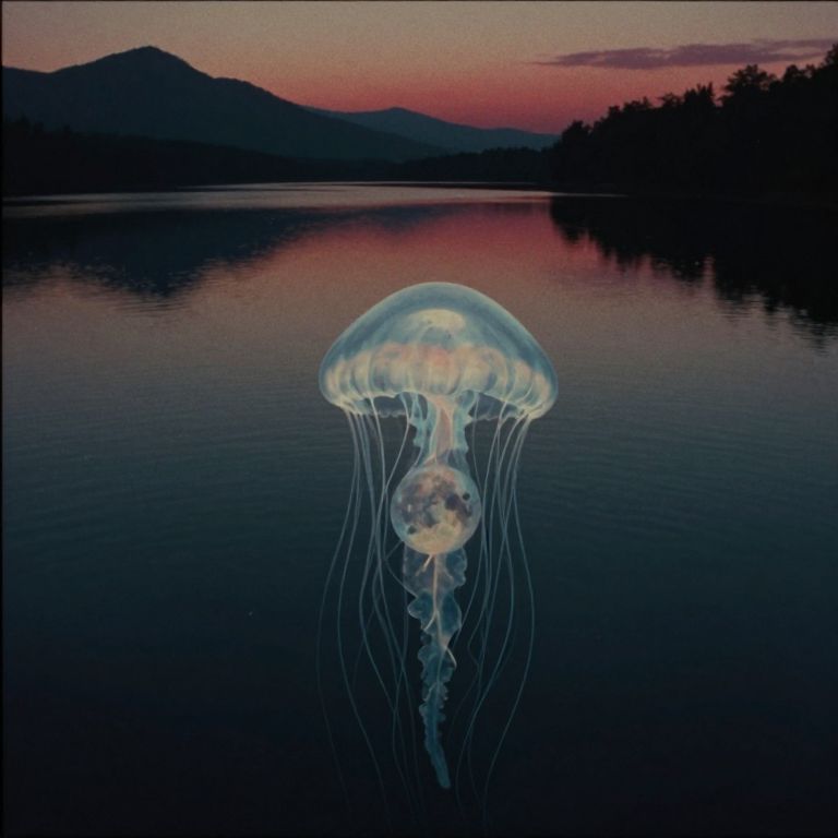 Envision an unsettling digital piece reminiscent of Zdzislaw Beksinski's eerie style, portraying a tranquil lake bathed in the dim light of dusk. Within this haunting scene, an enigmatic, ghostly entity rises from its depths, exhibiting an alien silhouette that melds features of both a jellyfish and an inflated moon, with translucent appendages undulating in an imperceptible flow. Captured from an overhead viewpoint, this surreal tableau presents the magnificence of the unearthly spectacle against a backdrop of shadowy mountains and a crimson sky at the horizon, invoking a dichotomy of wonder and unease. The artwork should showcase meticulously rendered textures reminiscent of analog film - coarse, faded hues, and marked by a vintage vignette effect - emphasizing the subdued tones and discolorations characteristic of aged footage.
