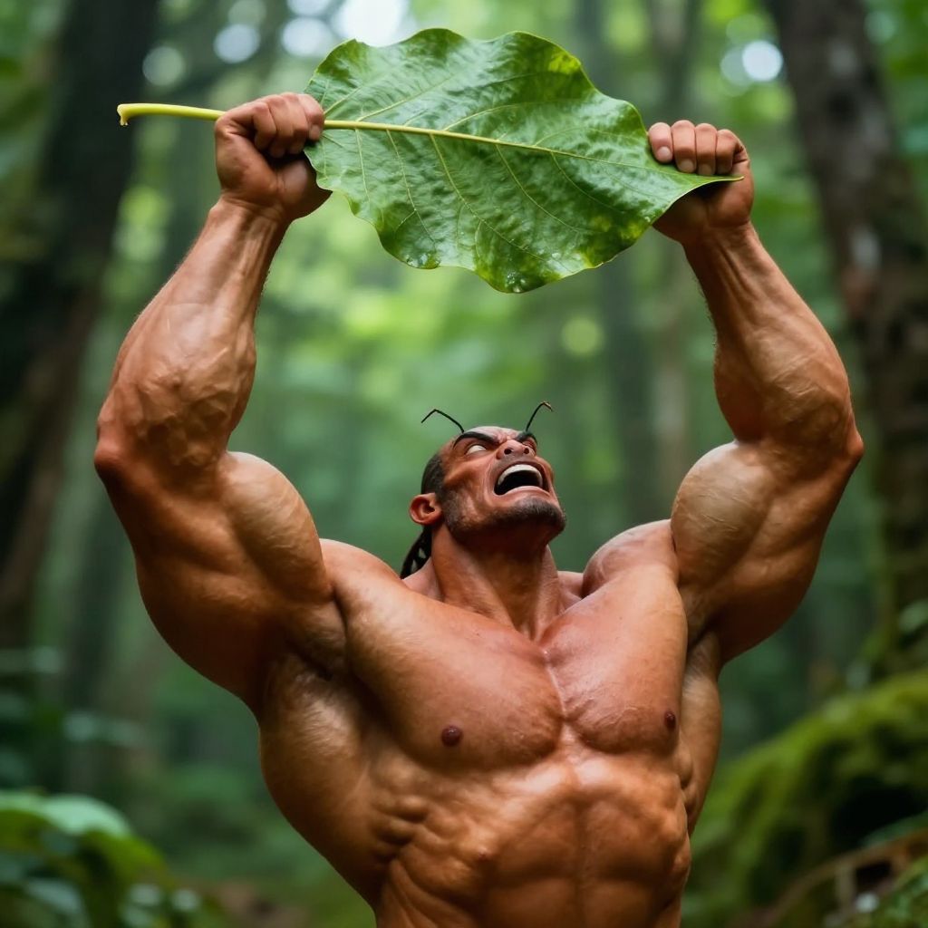 Muscular ant lifting a heavy leaf, exaggerated biceps and chest, vibrant forest setting, dramatic lighting, close-up view, fantasy realism, ultra-detailed