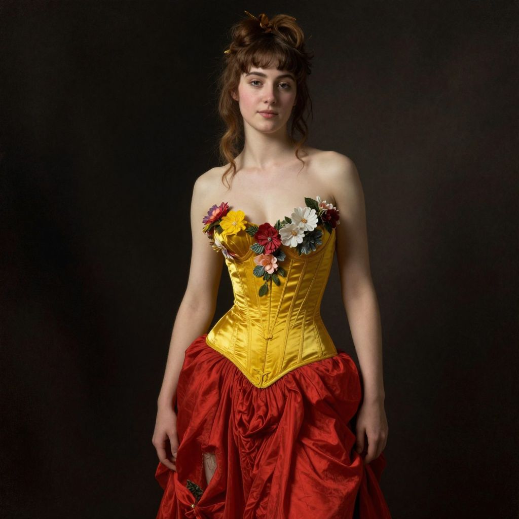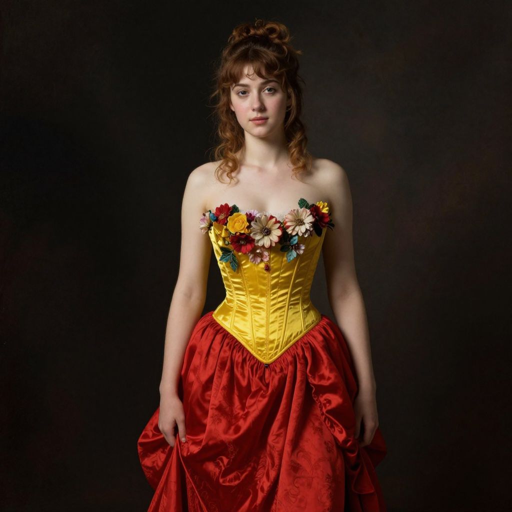 A digitally rendered portrait reminiscent of Lord Frederic Leighton's style, featuring a woman in a vibrant yellow corset adorned with floral embellishments and a flowing red skirt, set against a dark, moody background with dramatic lighting effects.