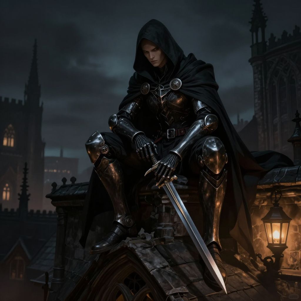 Dnd warforged art, a highly detailed warforged rogue, sleek metallic limbs with hidden blades, dressed in shadowy cloaks, perched atop a gothic city rooftop at night, lantern light casting eerie shadows, fantasy concept art, dramatic and moody