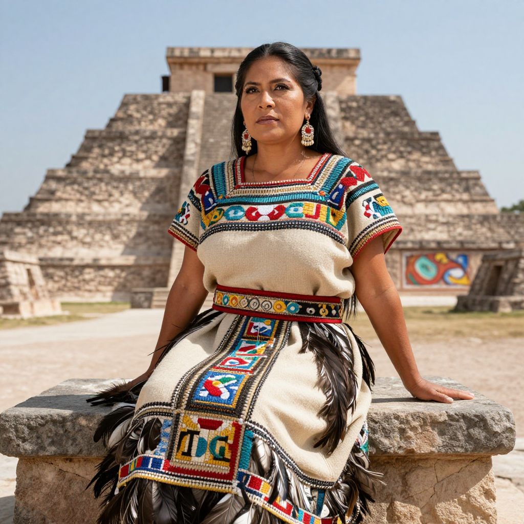 Photograph of an Indigenous woman in colorful, embroidered traditional dress with feather skirt, standing against ancient Mayan pyramid backdrop.