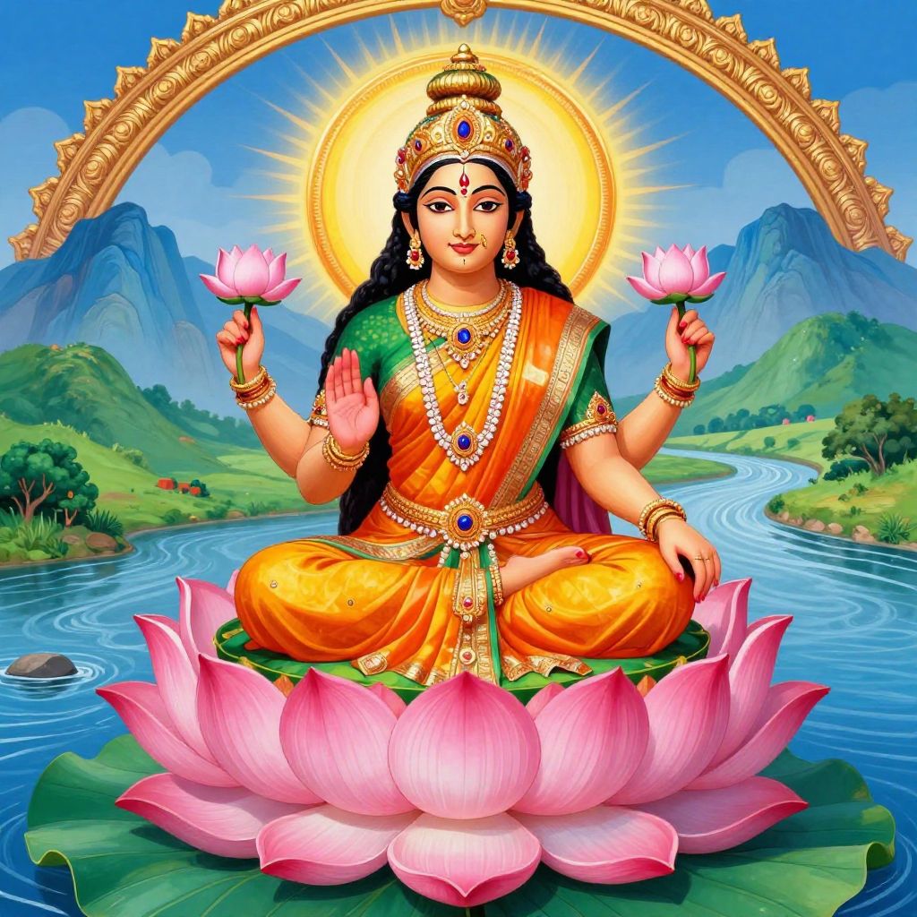 Colorful artistic depiction of Hindu goddess Lakshmi seated on a large pink lotus flower with a radiant halo behind her head. She holds lotus flowers in two of her four hands, wearing traditional jewelry and a vibrant sari in shades of orange, yellow, and green. The background includes blue mountains, green hills, and a flowing river under a decorative golden arch.