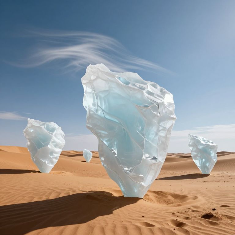 A desert of floating, translucent ice sculptures shifts with the wind, casting spectral shadows that dance across the sky.