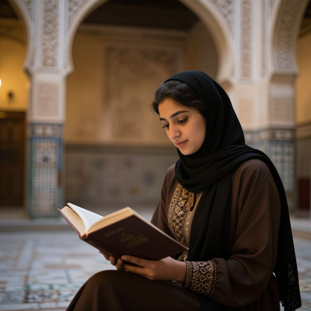 Arab girl reading a book under a shaded courtyard in a historic Medina, intricate tile work, warm ambient light, soft focus on her expression, cultural depth, elegant composition, highly detailed, realistic style.