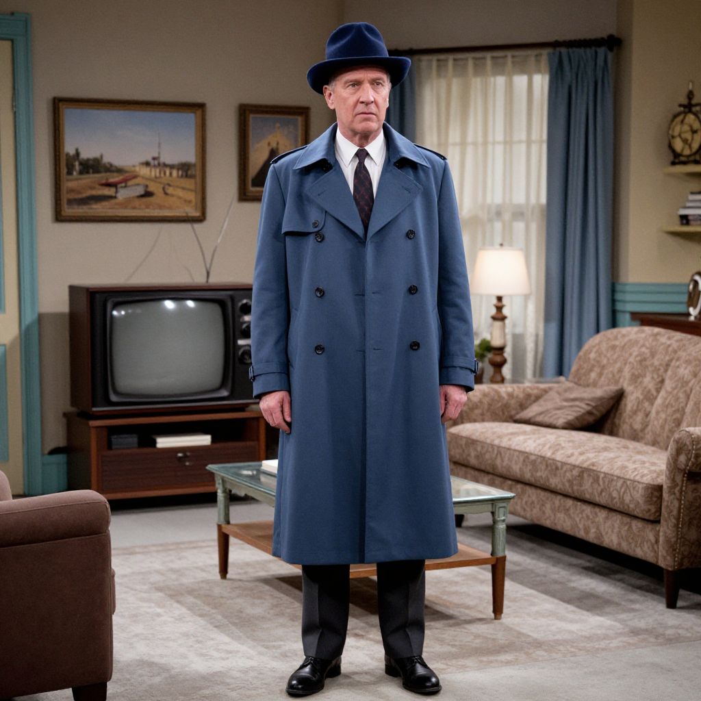 Photograph of an older Caucasian man standing in a living room. He wears a dark blue, knee-length overcoat, a black fedora, black tie, white shirt, and black shoes. The room features beige walls, blue curtains, a brown sofa, a beige patterned sofa, a glass coffee table, and an old-fashioned TV on a wooden stand. Two framed landscape paintings hang on the wall. The room is well-lit by natural light from a window with sheer curtains. The man's expression is serious, and he stands with a slightly forward lean. The overall style is vintage, evoking a mid-20th-century detective aesthetic.