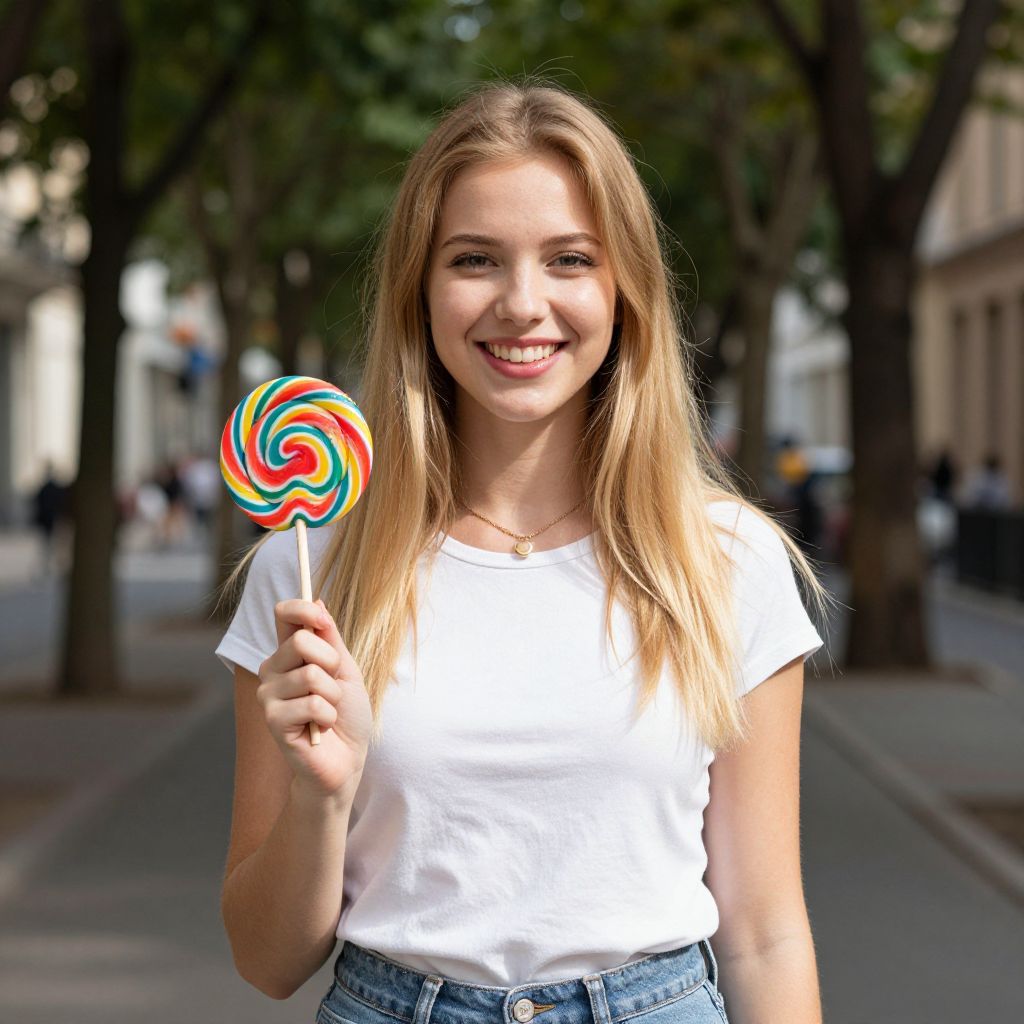 Photograph of a smiling young blonde woman with straight hair, wearing a white t-shirt and blue jeans, holding a colorful swirl lollipop, standing on